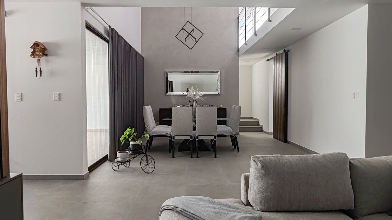 En planta alta se ubica el área de TV con salida a terraza, dos recámaras secundarias con clóset y un baño completo. La recámara principal se localiza en planta baja e incluye baño completo, vestidor y terraza privada. La casa cuenta con paneles solares, cisterna de 30,000 litros, hidroneumático, persianas y cortinas, además de cortina automatizada en la terraza del jardín.
