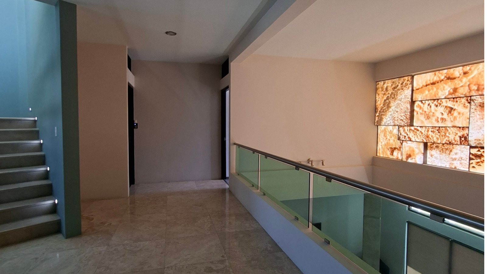 La residencia se distingue por su sala a doble altura con un elemento escultórico de ónix natural traslúcido retroiluminado, que aporta calidez y carácter arquitectónico único. Los ventanales de gran formato integran comedor, sala y terraza hacia el jardín perimetral con alberca privada, generando una experiencia continua entre interior y exterior ideal para convivencia y eventos sociales.
